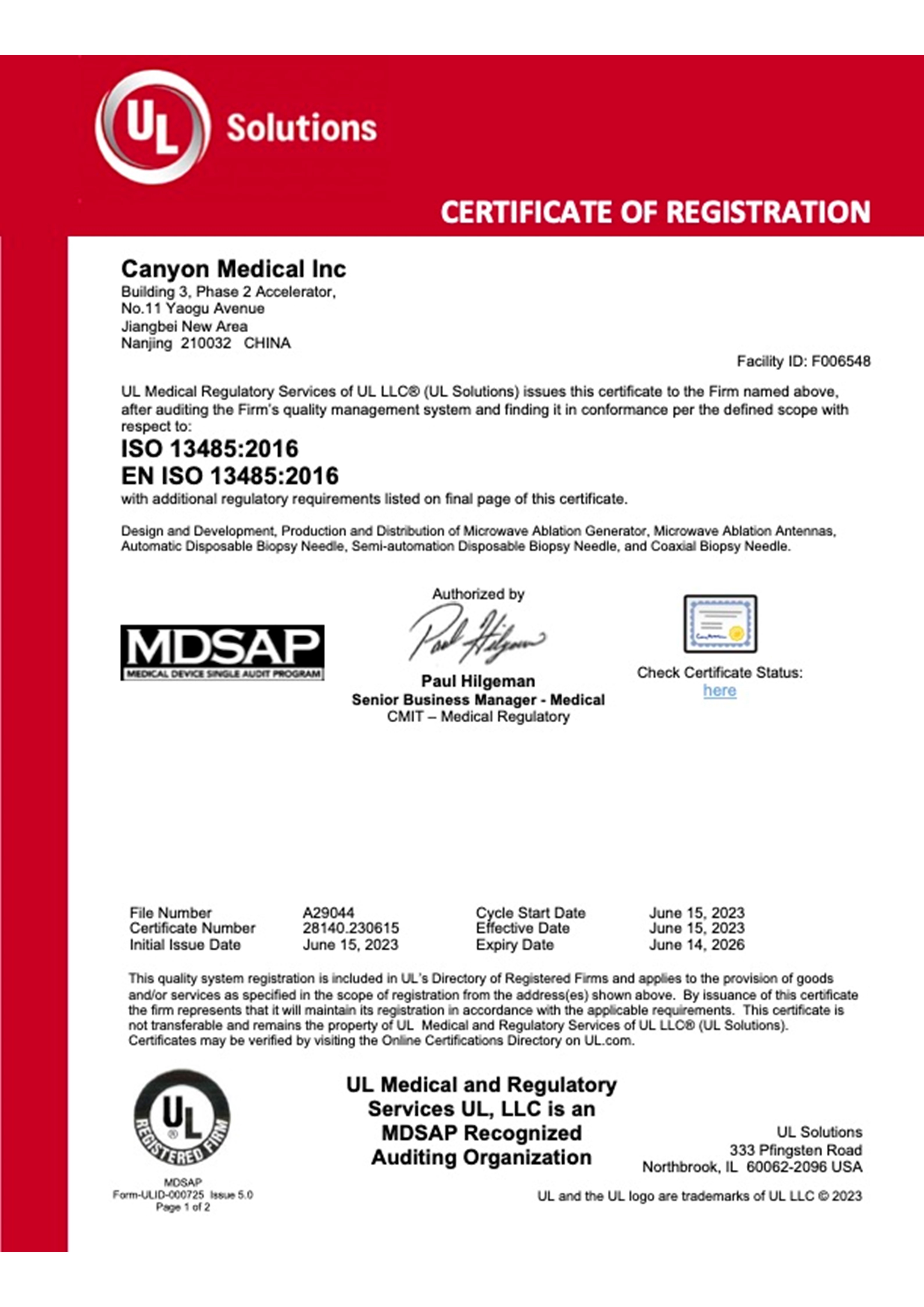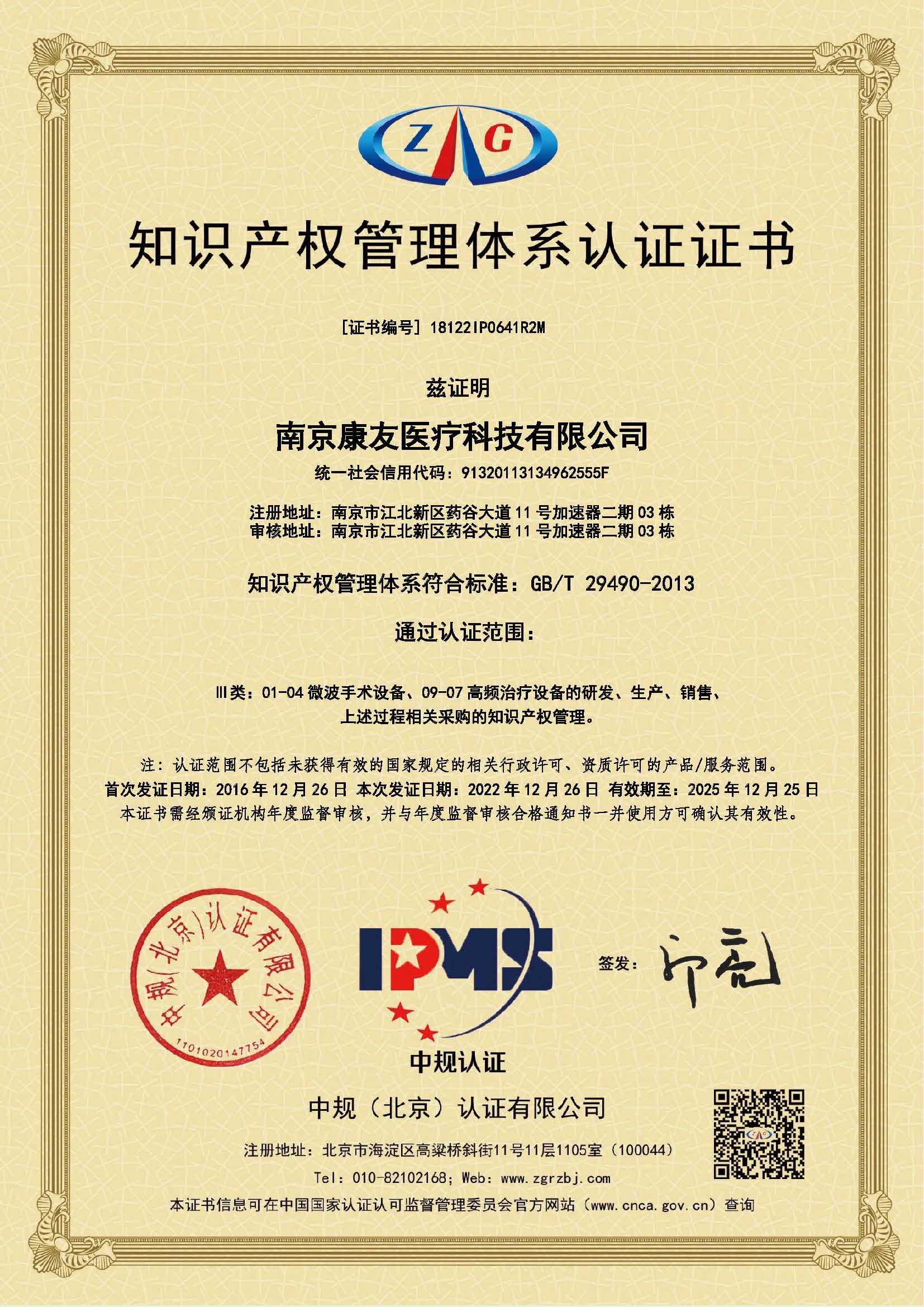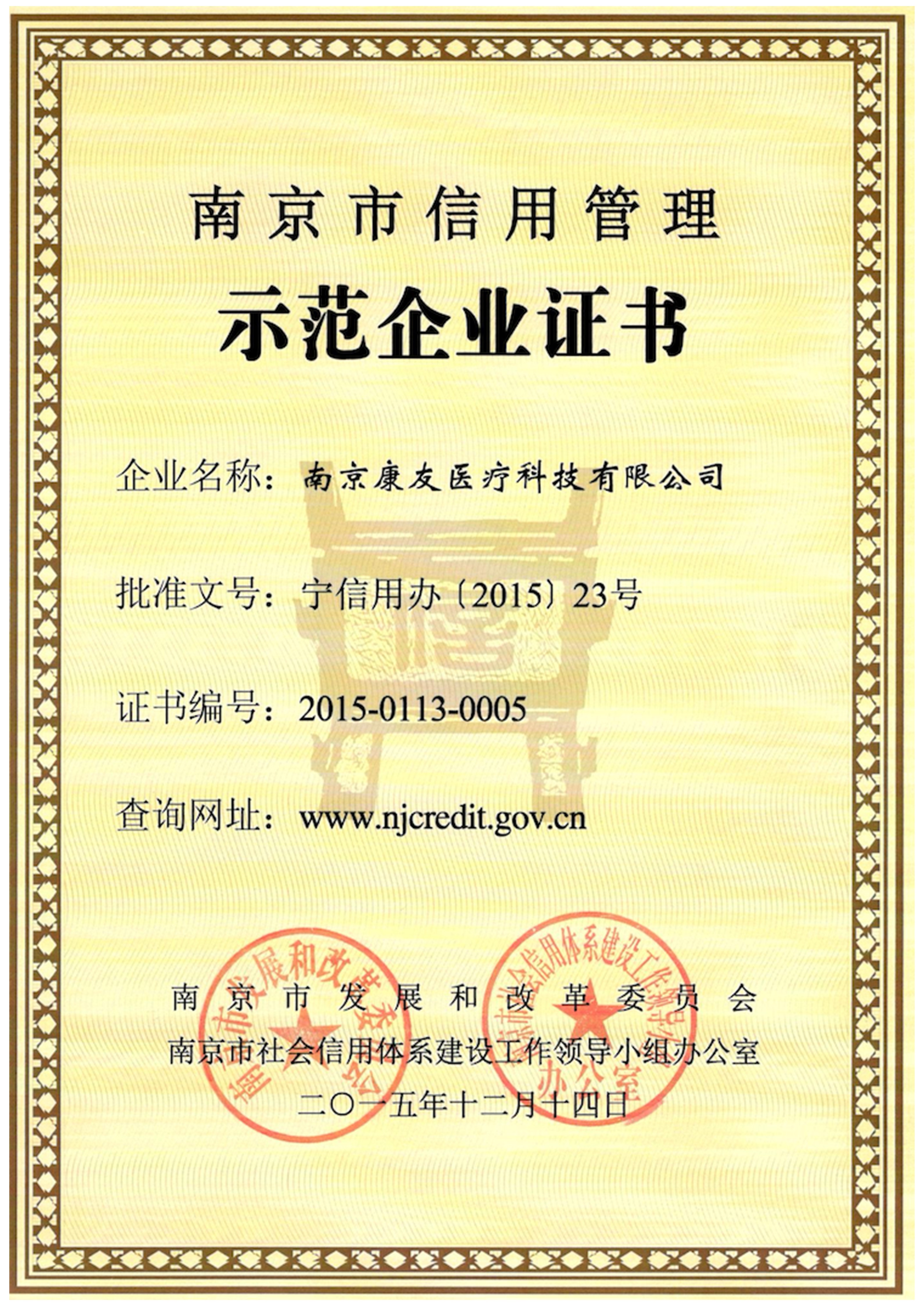 公司质量管理体系通过国际知名认证机构“TÜV SÜD”的ISO13485体系认证,知识产权管理体系通过“中规(北京)认证有限公司”的体系认证,信用管理体系获得“江苏省社会信用体系建设领导小组办公室”颁发的“江苏省企业信用管理贯标证书”,公司被南京市发改委认定为“南京市信用管理示范企业”,被江苏省医疗器械行业协会认定为“江苏省医疗器械生产企业优秀诚信单位”。