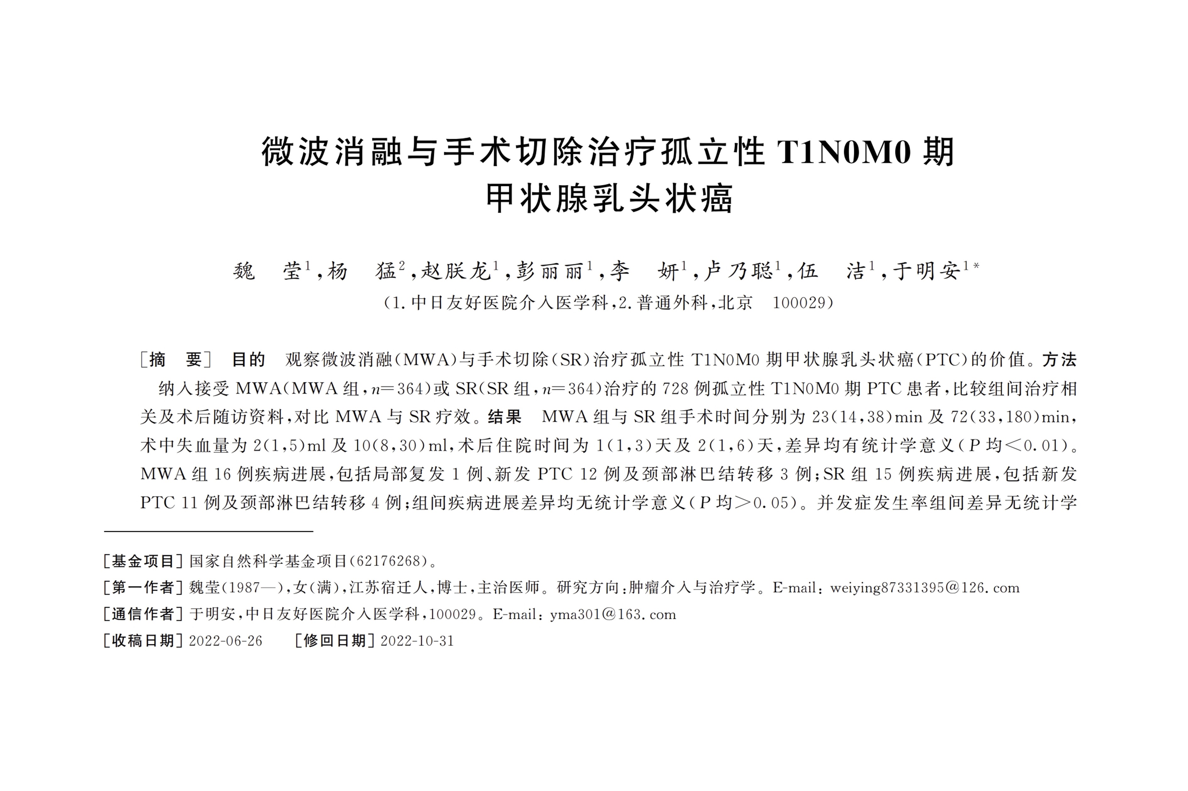 观察微波消融(MWA)与手术切除(SR)治疗孤立性T1N0M0期甲状腺乳头状癌(PTC)的价值,结果表示MWA治疗孤立性T1N0M0期PTC的安全性及有效性与SR相当。