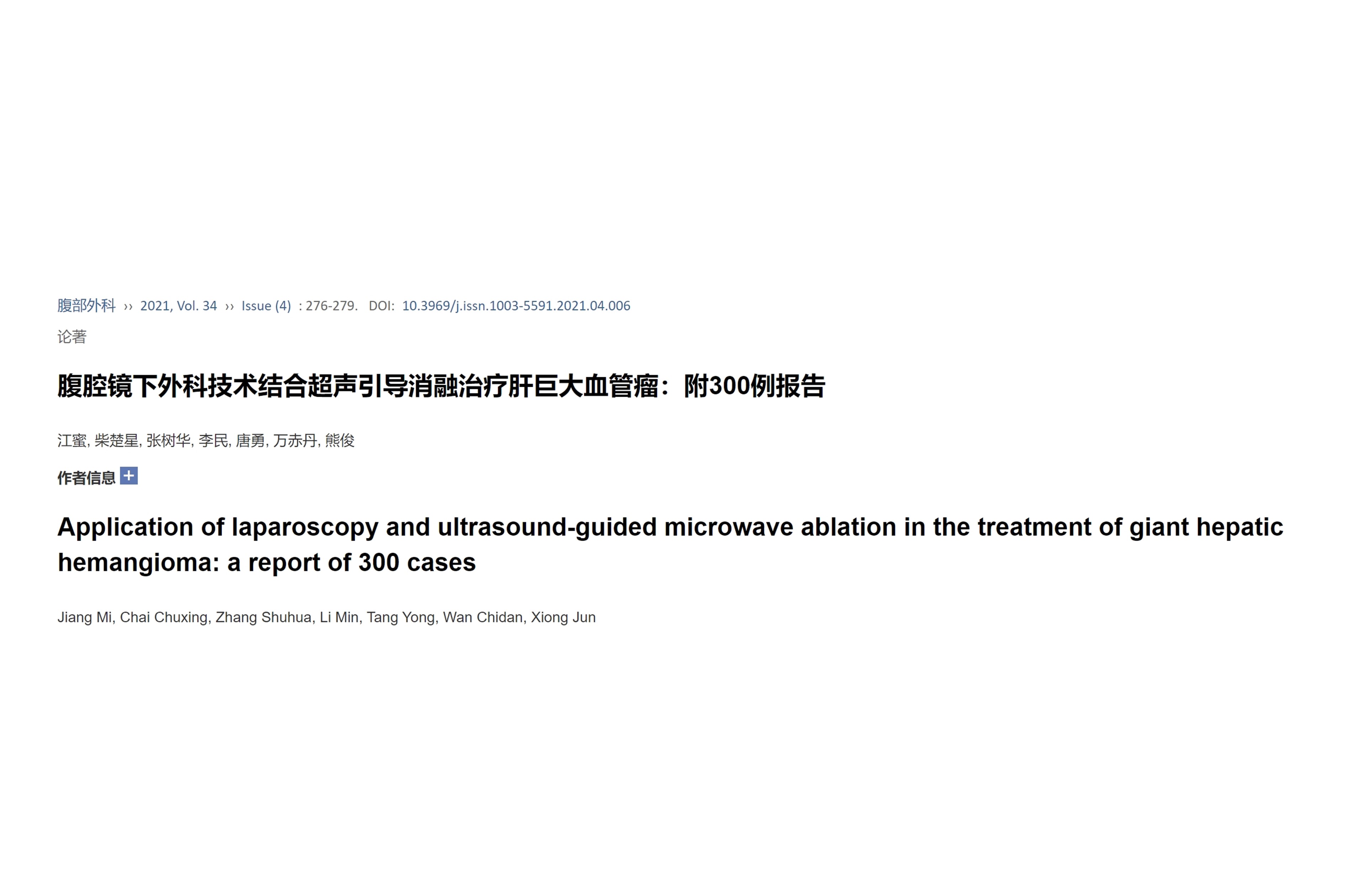 回顾性分析2015年10月至2021年3月于华中科技大学同济医学院附属协和医院接受腹腔镜下超声引导消融治疗肝巨大血管瘤300例病人的临床资料。腹腔镜外科技术结合腹腔镜超声引导下血管瘤消融具有安全、微创、有效、并发症...